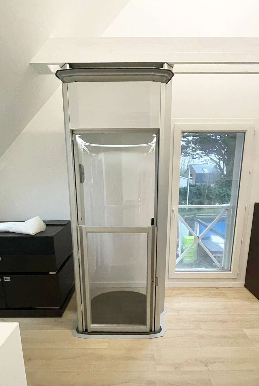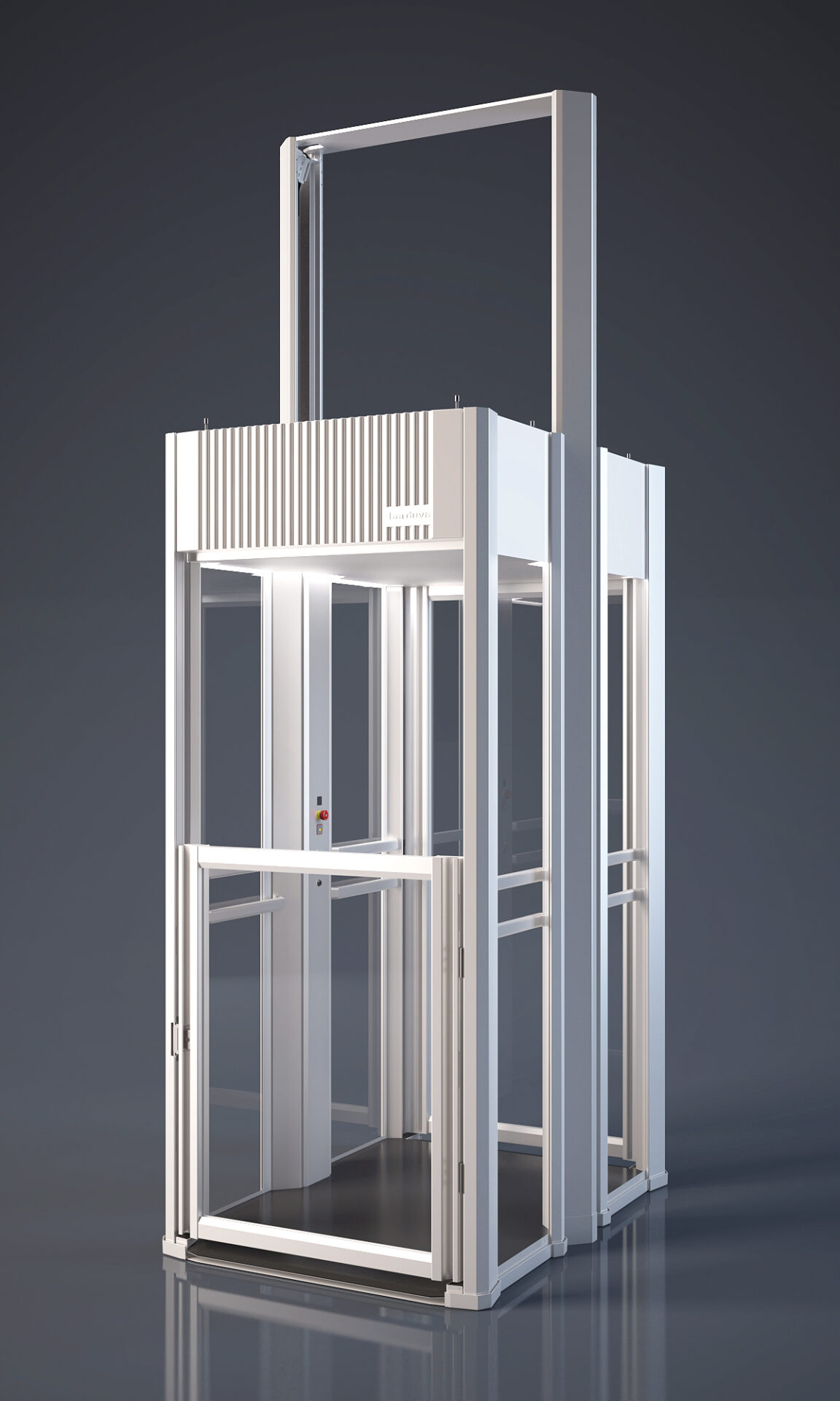 Kompakte Liftloesung mit groesserer Plattform fuer bis zu drei Personen oder Rollstuhl, einfache Installation ohne Schacht und hoher Komfort im Alltag.